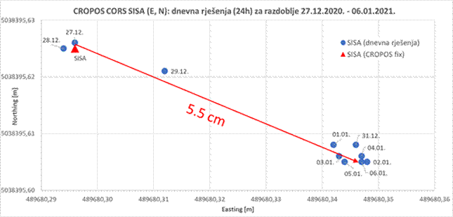 Nastavno na istraživanja o utjecaju potresa 28. i 29.12.2020. na pomicanje tla u epicentralnom području Petrinje, Siska i Gline, doc. dr. sc. Danijel Šugar i prof. dr. sc. Željko Bačić s Katedre za satelitsku geodeziju Geodetskog fakulteta Sveučilišta u Zagrebu obavili su računanja i analizu položaja permanentne stanice CROPOS mreže u Sisku (CORS SISA). Računanja dnevnih rješenja (3D položaja) permanentne GNSS stanice Sisak i analiza dobivenih rezultata pokazali su da se CORS SISA horizontalno pomaknula za 5,5 cm u smjeru jugoistoka i spustila se za cca 2 cm!